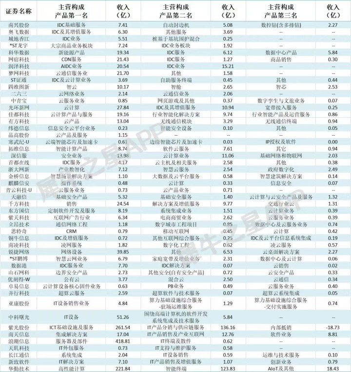 犀牛之星APP研究院初步筛选了主营构成业务前三名包含有IDC、云服务、智算和IT设备的公司: